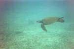A surreal view of Giant Green Sea Turtle 12 feet below water surface diving along Kaui Hawaii.